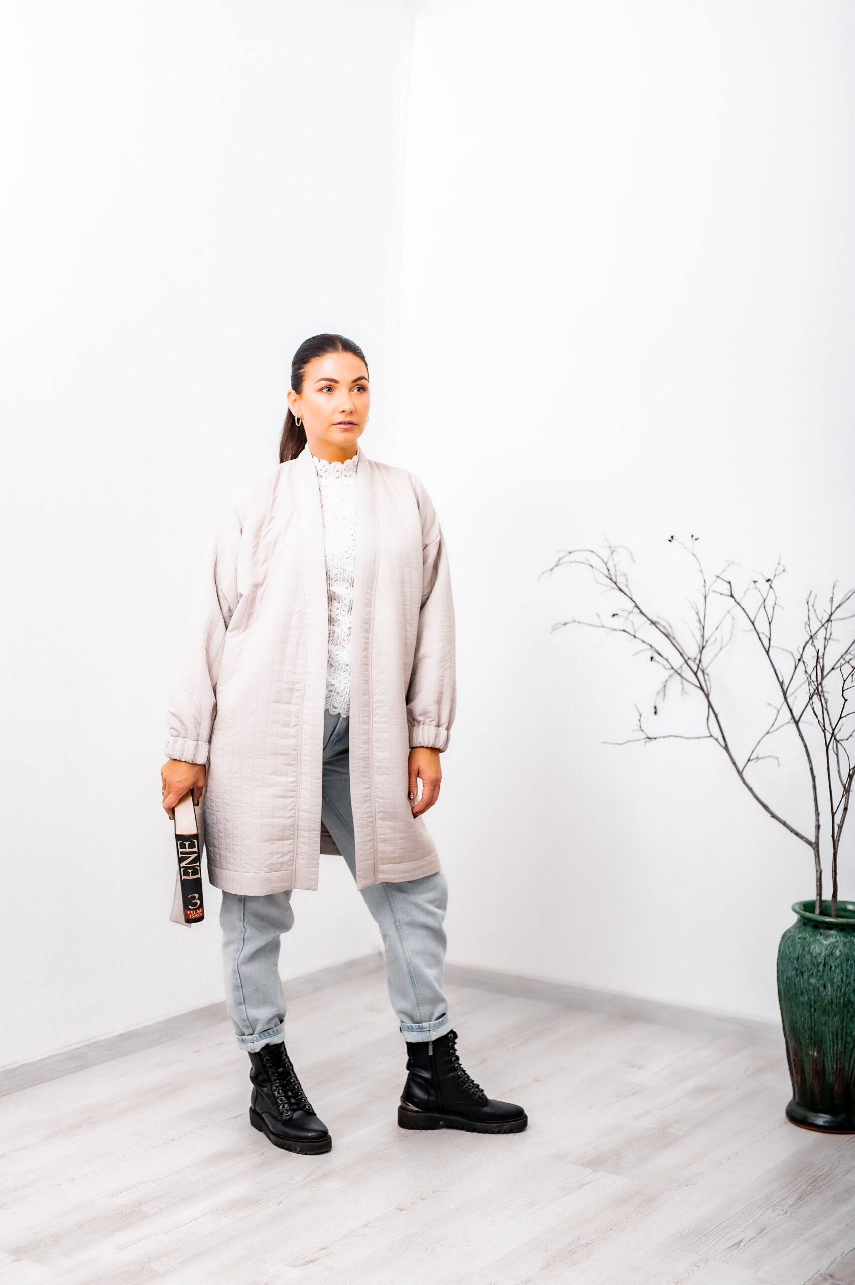 Stiilne ja kerge helehall kimonojope, mis sobib suurepäraselt igapäevaseks kandmiseks soojemal talvisel ajal, sügisel ja jahedal suveõhtul! jope on saadaval suuruses S-M. Omadused: ✨ Lühike pikkus – pakub nii soojust kui ka šikki välimust. ✨ Vööga – võimalus jope figuurile sobivalt ümber sättida ja lisada isikupära. ✨ Õhem ja kerge – ideaalne kuni paari miinuskraadini, sobides suurepäraselt kihiliseks kandmiseks. Seemantel on inspireeritud kergusest ja lihtsusest – suurepärane valik nii linnatänavatele kui ka rahulikeks jalutuskäikudeks looduses. Kombineeri seda oma lemmik villase kampsuni, lemmikteksade ja stiilsete saabastega, et luua soe ja moodne talvine look! Täienda oma garderoobi kimonojopega, mis ühendab praktilisuse ja naiseliku elegantsi! Kangas: 99% polüester, 1% spandex Modell on umbes 165cm pikk ja kannab S suurust.
