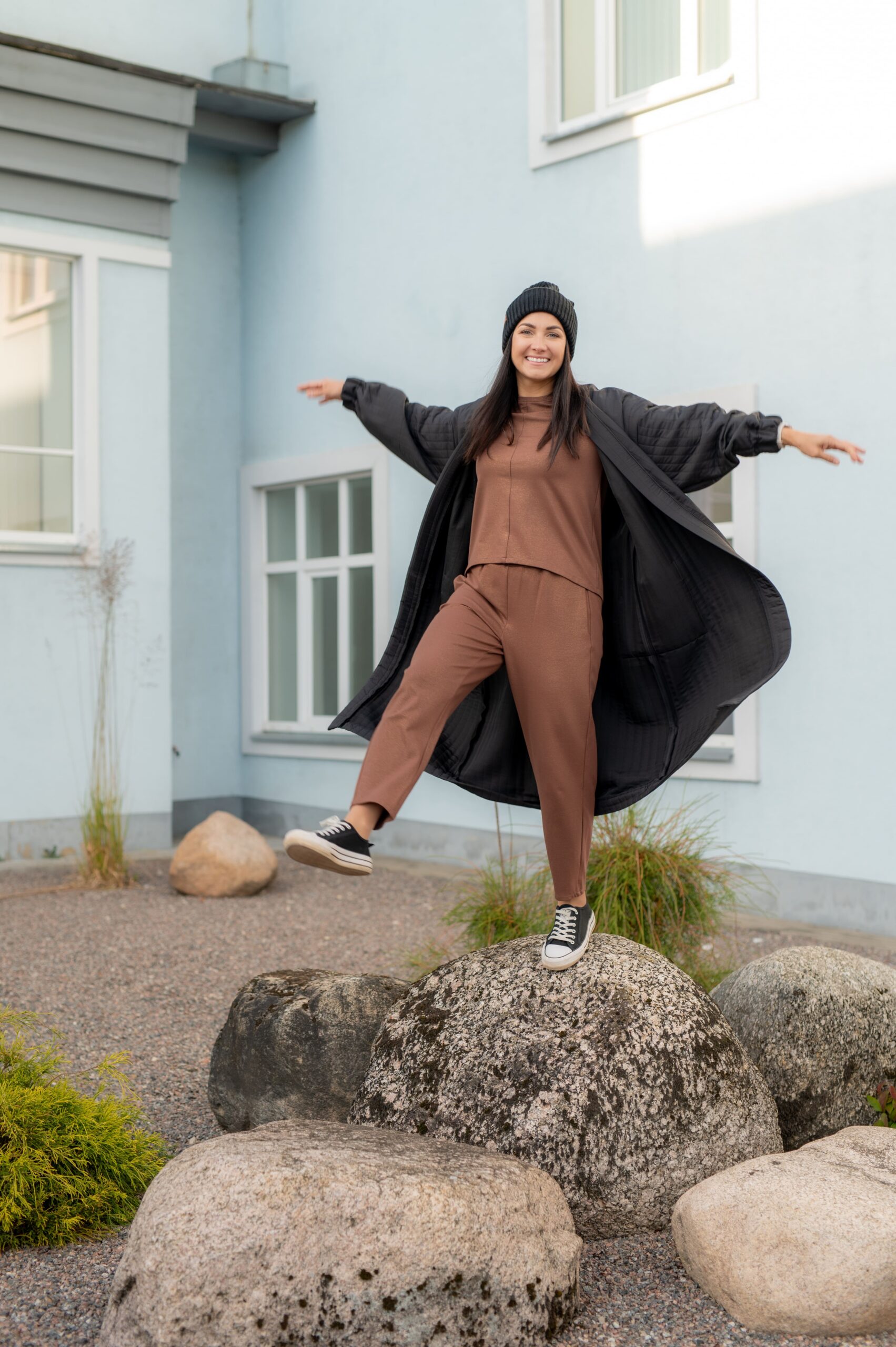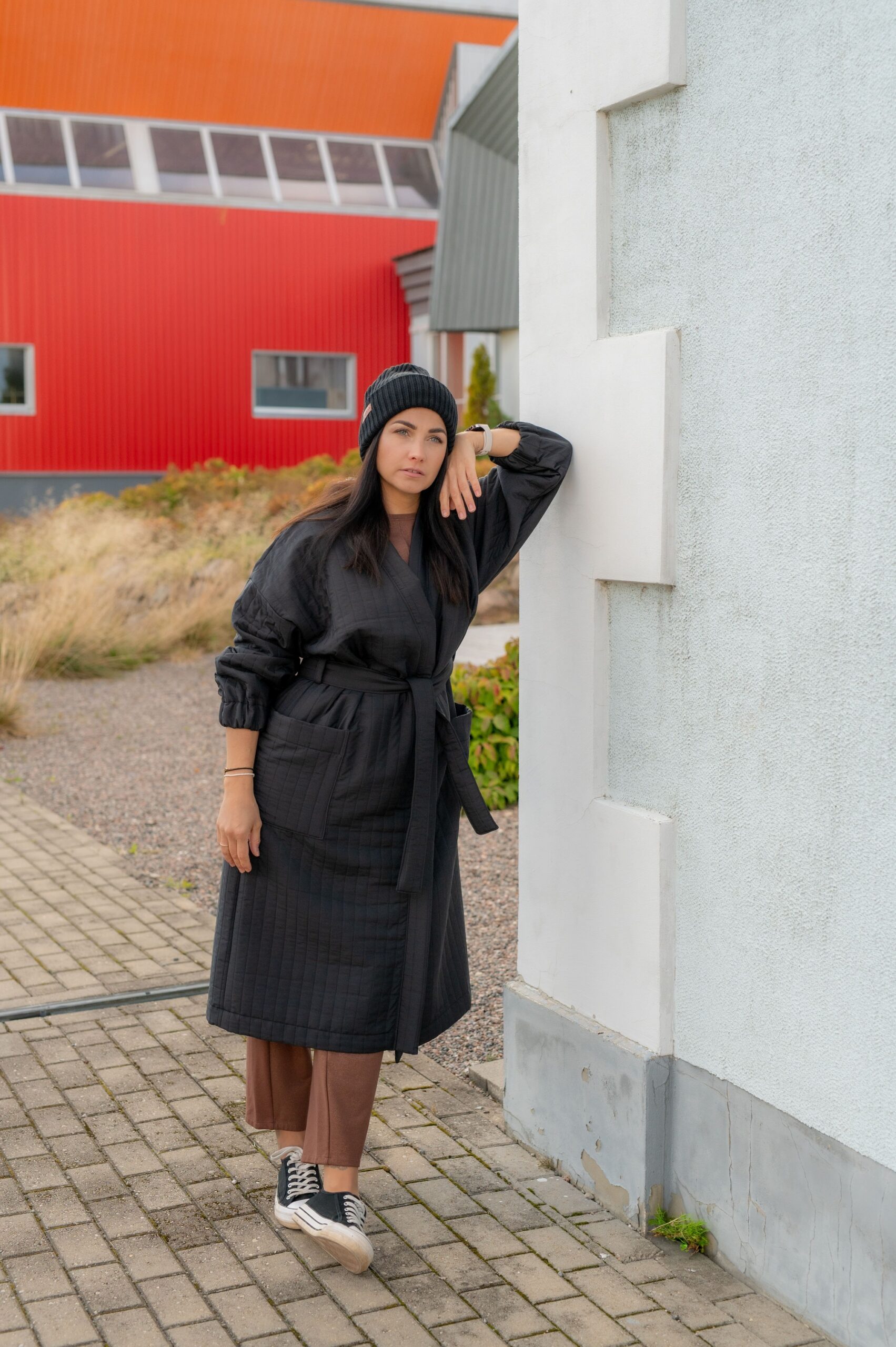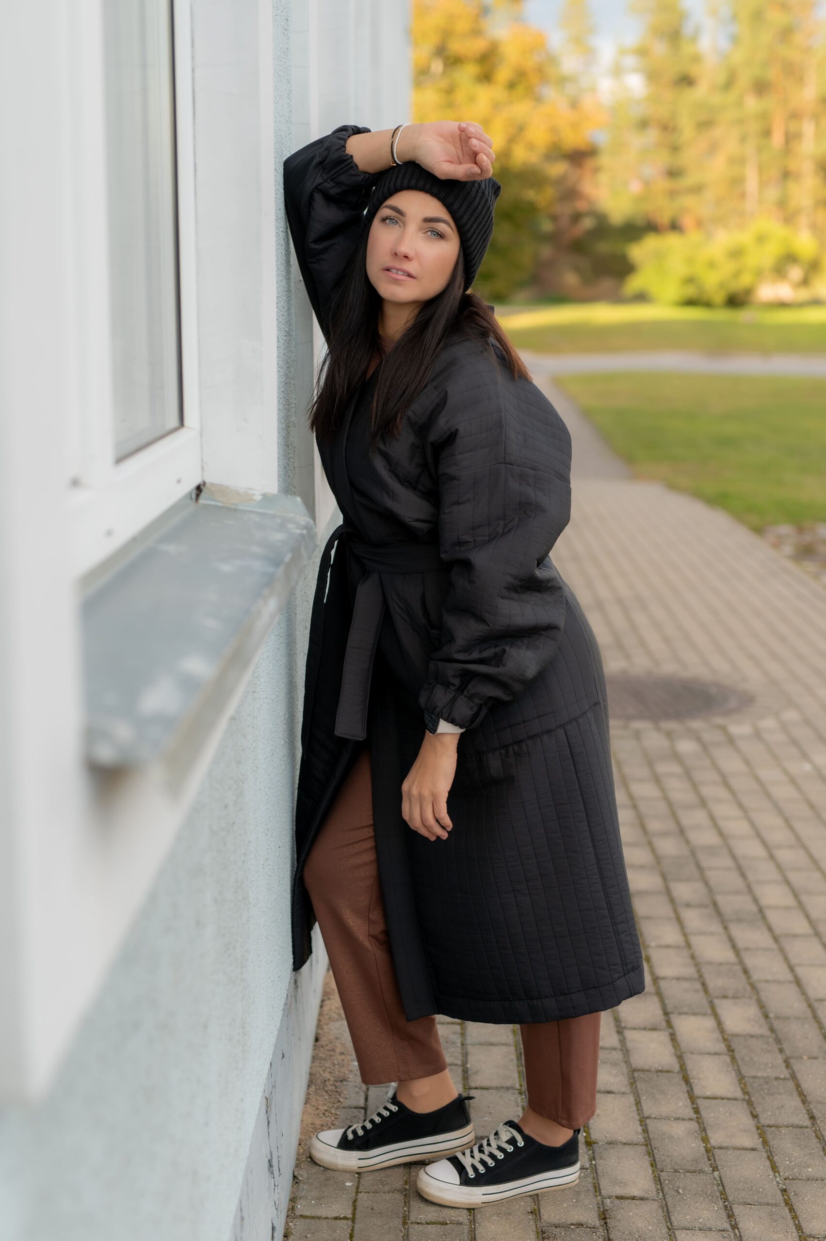 Stiilne ja kerge must kimonomantel, mis sobib suurepäraselt igapäevaseks kandmiseks soojemal talvisel ajal, sügisel ja jahedal suveõhtul! Mantel on saadaval kahes suuruses: S-M ja L-XL, tagades mugava sobivuse igale kehatüübile. Omadused:Midi pikkus – ulatub elegantselt poole sääreni, pakkudes nii soojust kui ka šikki välimust. ✨ Vööga – võimalus jope figuurile sobivalt ümber sättida ja lisada isikupära. ✨ Õhem ja kerge – ideaalne kuni paari miinuskraadini, sobides suurepäraselt kihiliseks kandmiseks. Seemantel on inspireeritud kergusest ja lihtsusest – suurepärane valik nii linnatänavatele kui ka rahulikeks jalutuskäikudeks looduses. Kombineeri seda oma lemmik villase kampsuni, lemmikteksade ja stiilsete saabastega, et luua soe ja moodne kevad-sügis look! Täienda oma garderoobi kimonomantel, mis ühendab praktilisuse ja naiseliku elegantsi! Kangas: 99% polüester, 1% spandex Modell on umbes 165cm pikk ja kannab väiksemat suurust.