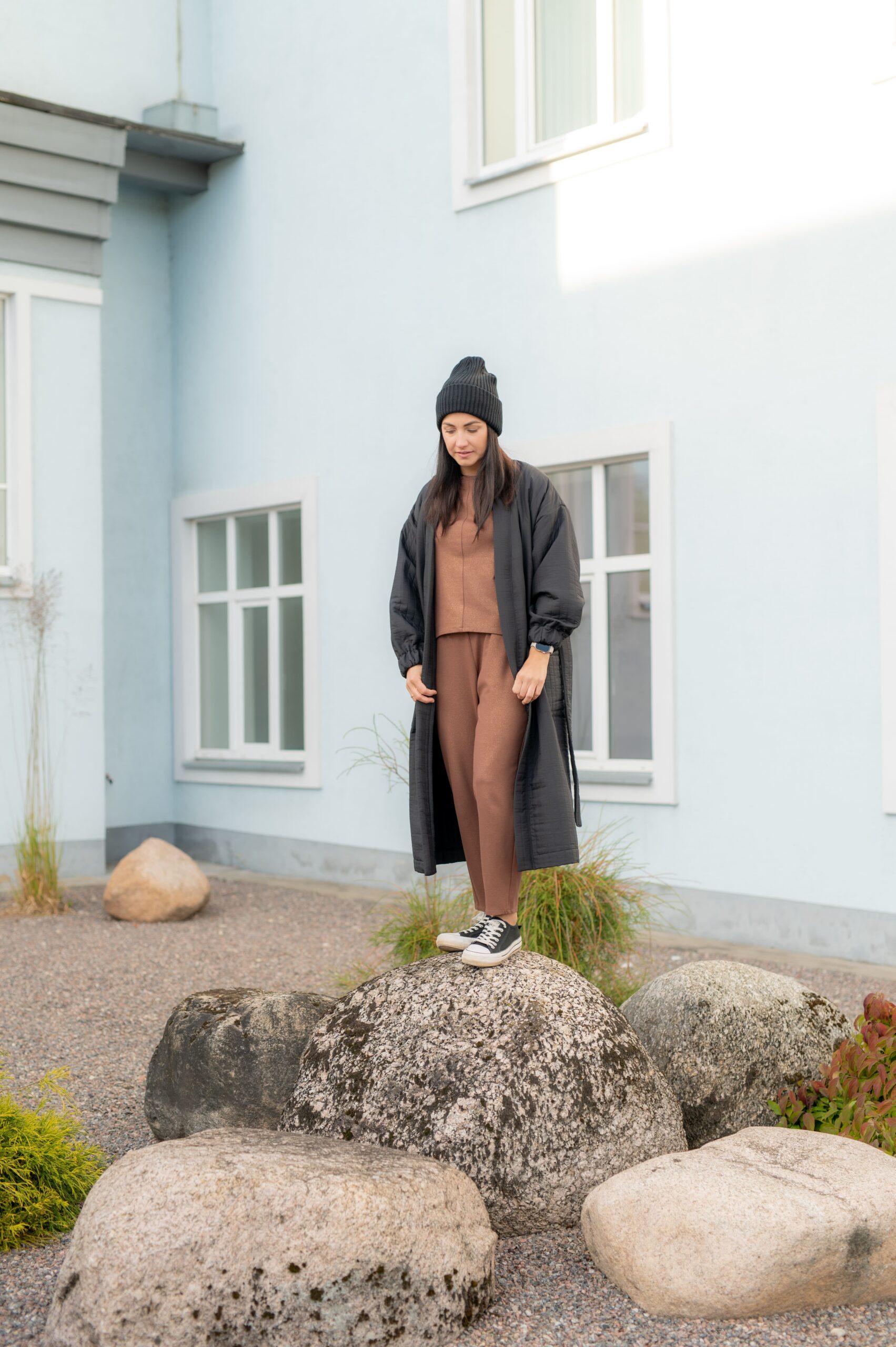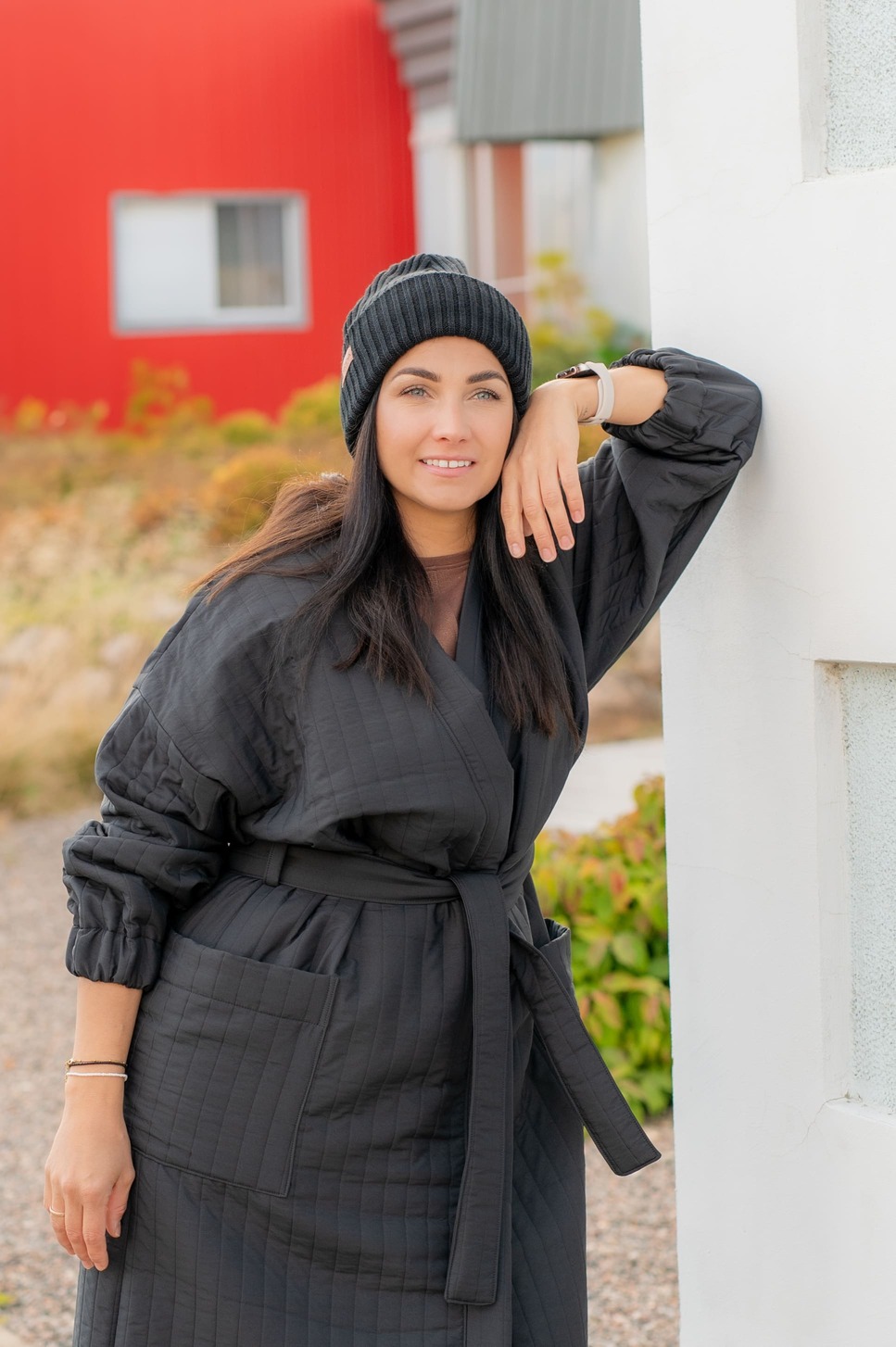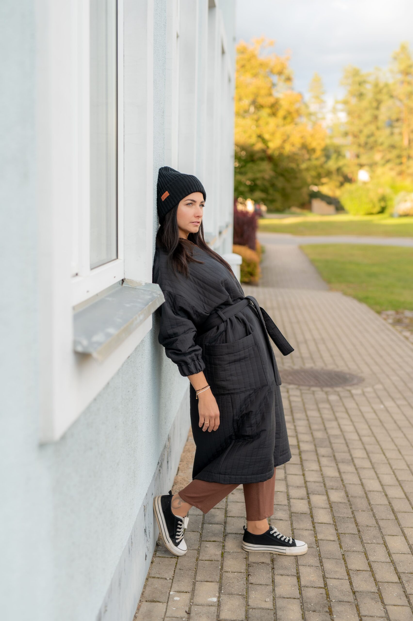 Stiilne ja kerge must kimonomantel, mis sobib suurepäraselt igapäevaseks kandmiseks soojemal talvisel ajal, sügisel ja jahedal suveõhtul! Mantel on saadaval kahes suuruses: S-M ja L-XL, tagades mugava sobivuse igale kehatüübile. Omadused:Midi pikkus – ulatub elegantselt poole sääreni, pakkudes nii soojust kui ka šikki välimust. ✨ Vööga – võimalus jope figuurile sobivalt ümber sättida ja lisada isikupära. ✨ Õhem ja kerge – ideaalne kuni paari miinuskraadini, sobides suurepäraselt kihiliseks kandmiseks. Seemantel on inspireeritud kergusest ja lihtsusest – suurepärane valik nii linnatänavatele kui ka rahulikeks jalutuskäikudeks looduses. Kombineeri seda oma lemmik villase kampsuni, lemmikteksade ja stiilsete saabastega, et luua soe ja moodne kevad-sügis look! Täienda oma garderoobi kimonomantel, mis ühendab praktilisuse ja naiseliku elegantsi! Kangas: 99% polüester, 1% spandex Modell on umbes 165cm pikk ja kannab väiksemat suurust.